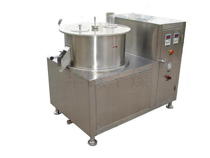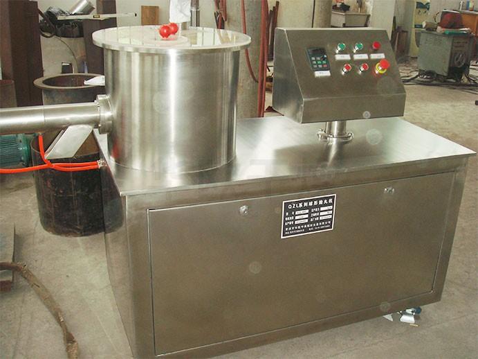 将前道工序做成的湿颗粒投入旋转离心盘内,使湿颗粒受到环隙空气浮力、旋转离心力、自身重力作用。呈环形绳股状运动,从合理方向通过多流体喷枪向运动料层喷入配方液,从而形成圆球度很高的球丸,原理与旋转流化床类似。