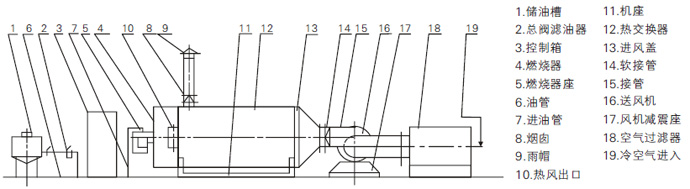 燃料通过燃烧器燃烧,产生高温烟气。并借助具有强化换热措施的热风炉将高温烟气的热量传导给被加热的空气,高温燃气经热量散发后温度降低至250℃以下由引风机排放大气。需加热的空气通过选配的鼓风机强送入热风炉、吸热后温度升至额定值从热风出口送出,当热风温度降低到而定的下限温度时,燃烧器又会重新点燃运行或转为大火焰燃烧,升温的速度可调进风阀来实现。