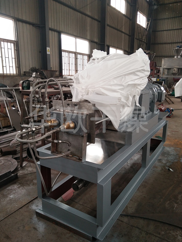 近日,石家庄某客户订购的一套双螺杆挤压制粒机已制作完毕,由于物料的特殊要求,我公司在原本的双螺杆挤压制粒机的基础上做了进一步的改进,增加了夹套及破碎装置,物料通过料斗送入主机内,通过夹套内的高温导热油加热物料并挤压成型,经过破碎直接形成短柱状颗粒,设备物料接触不锈钢制作,外部喷涂防锈油漆,并配备了导热油加热装置、电柜、关风机等。